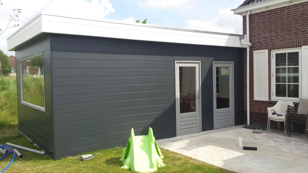 Het dak is voorzien van EPDM dakbedekking en dakisolatie. Zoals je ziet zijn de mogelijkheden voor het bouwen van een garage of kantoor zeer uitgebreid.