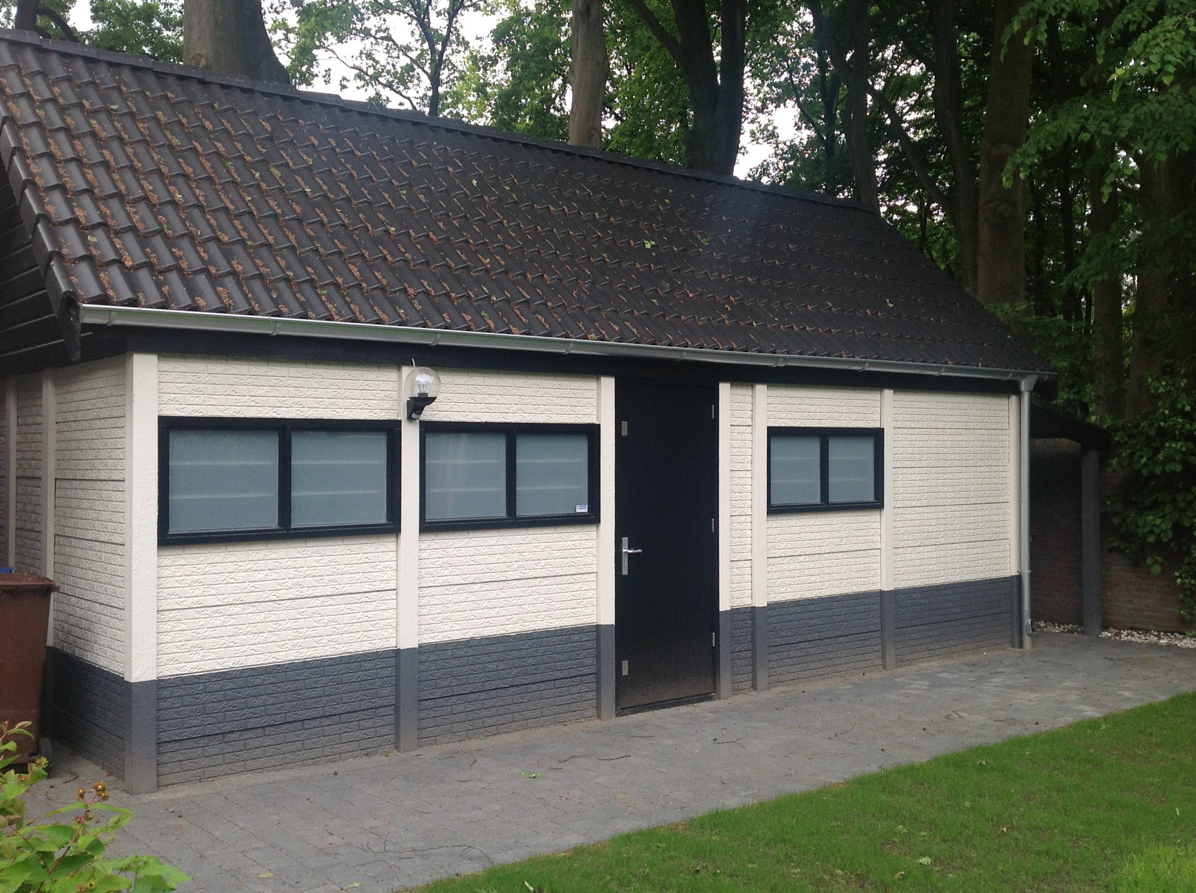 Deze betonnen berging bestaat uit wanden van steenmotief betonplaten.