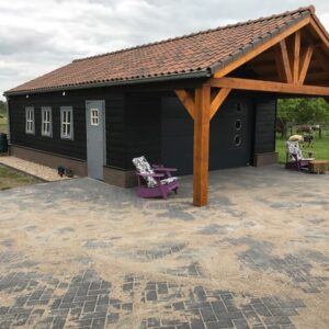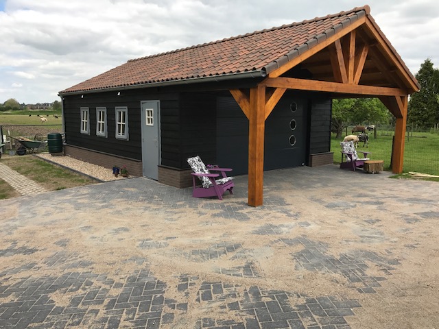 De garage is voorzien van een elektrische garagedeur en de carport heeft een open spant opgebouwd uit Douglas palen.
