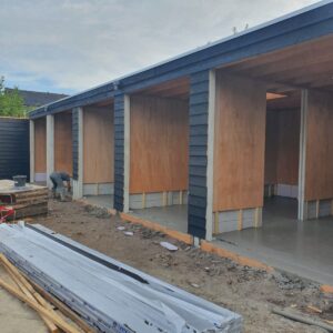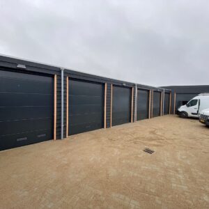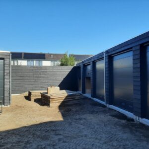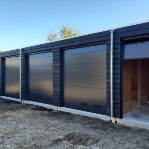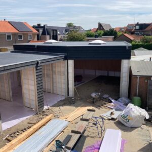 Voozien van houten gevelbekleding, elektrische garagedeuren en lichtkoepels. Geheel op maat gemaakt.
