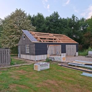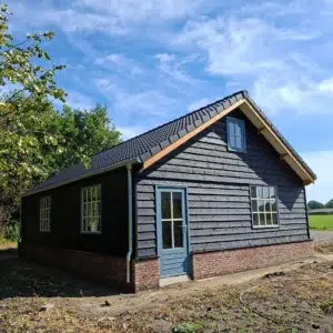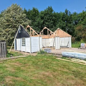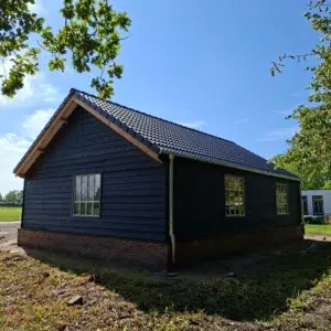 De ramen en deuren zijn voorzien van een grondlaag en het dak is gedekt met sneldekpannen.