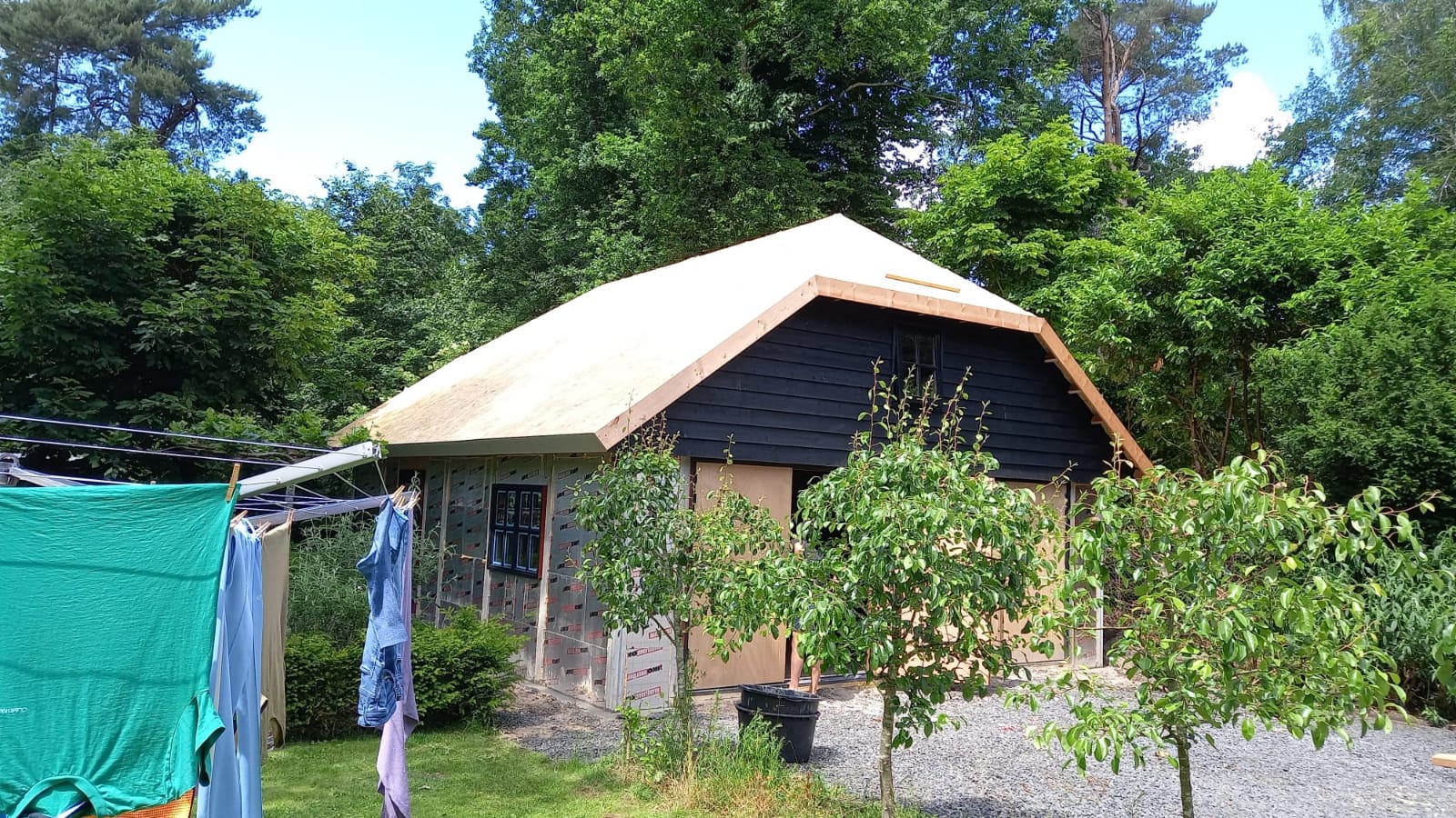 Gemetselde garage voorzien van rieten kap en dubbele garagedeur.