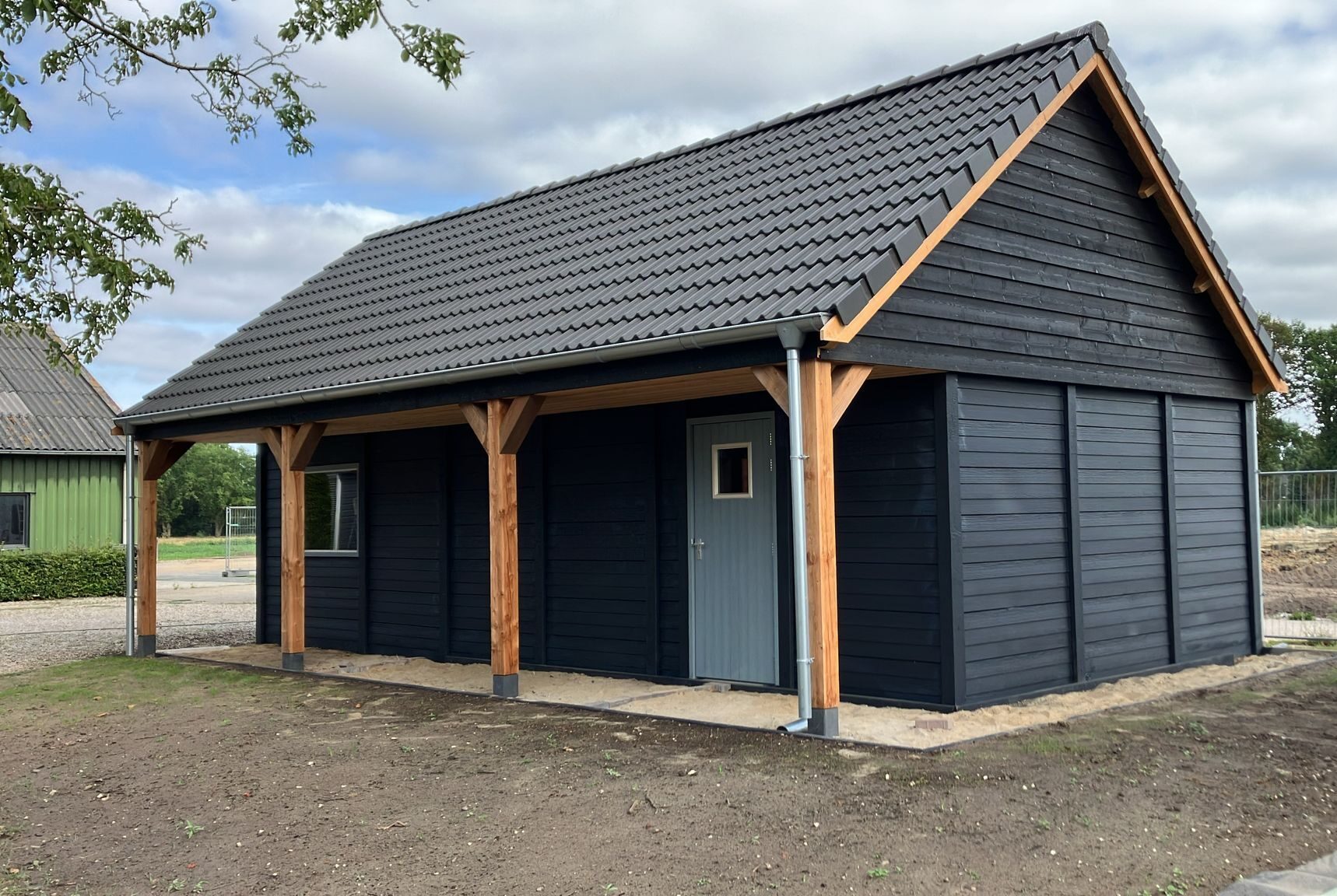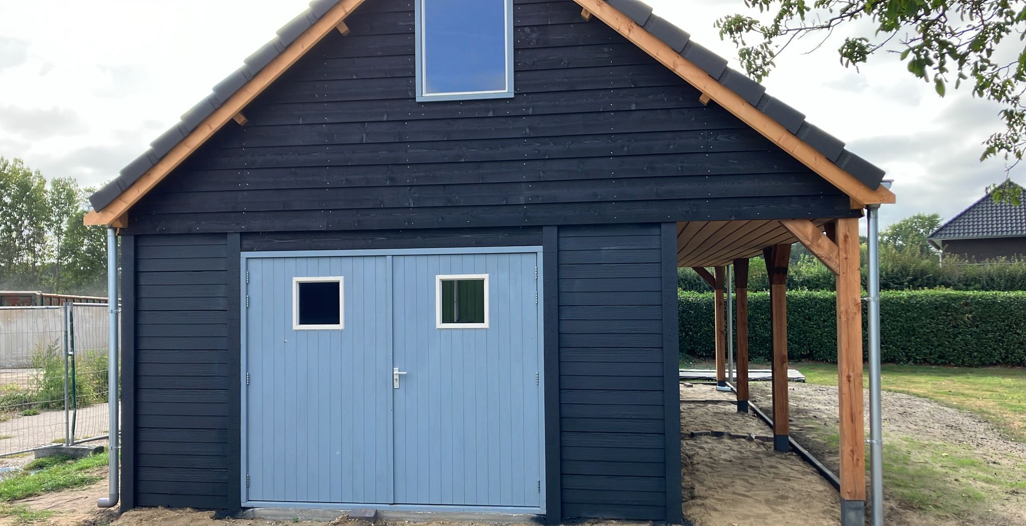 De garage is voorzien van een antraciet betoncoating en de kozijnen van grondverf. Op het dak zijn dakpannen aangebracht en de topgevel is voorzien van een raammodel voor extra lichtinval.