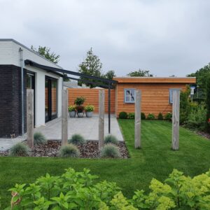 Prefab tuinhuis met bijpassende schutting. Tuinhuis met platdak en houten potdeksel gevel bekleding.