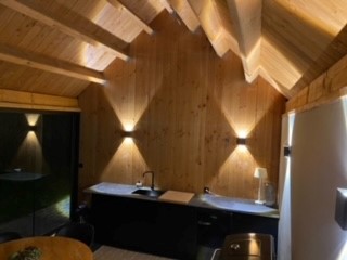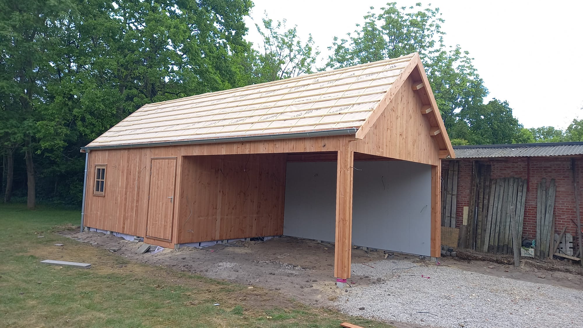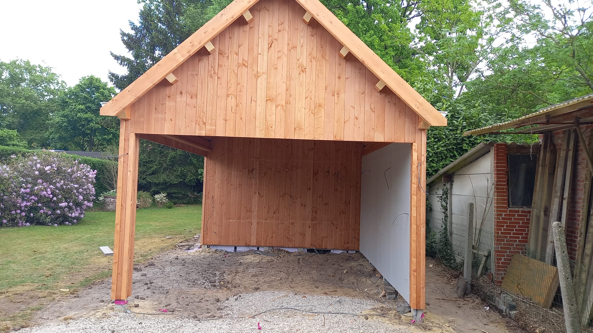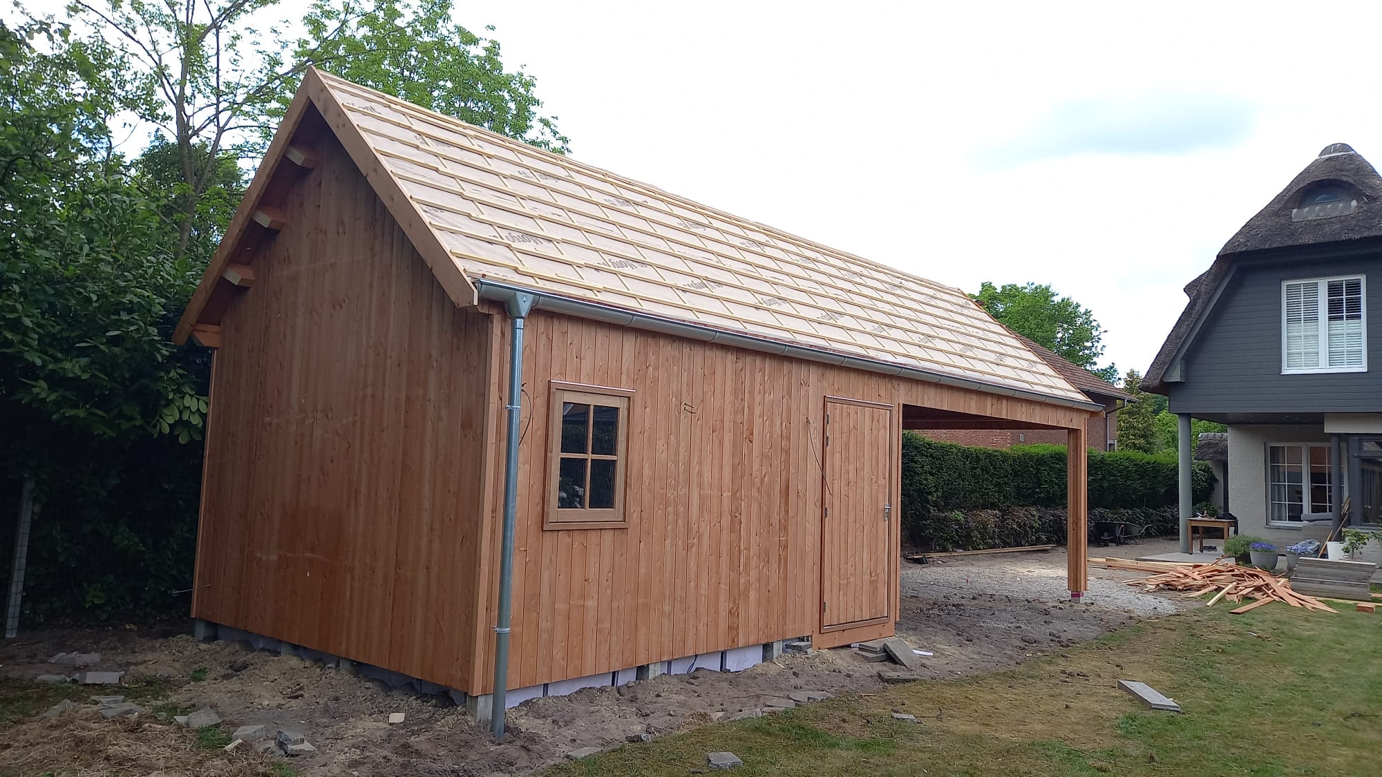 In Brasschaat, België hebben wij een ruim tuinhuis met overkapping geplaatst, de buitengevels zijn bekleed met Douglas hout, verticaal aangebracht.