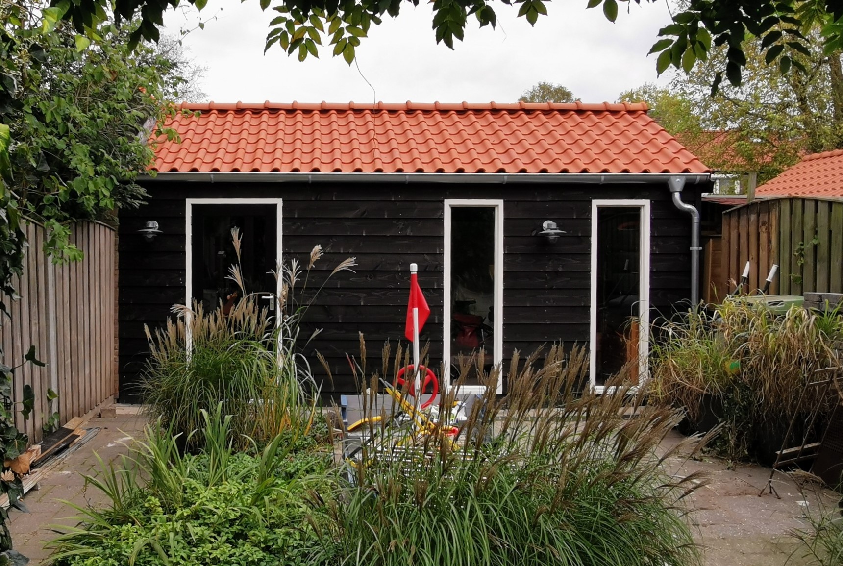 Het tuinkantoor is voorzien van keramische dakpannen en grote raampartijen welke zorgen voor veel lichtinval.